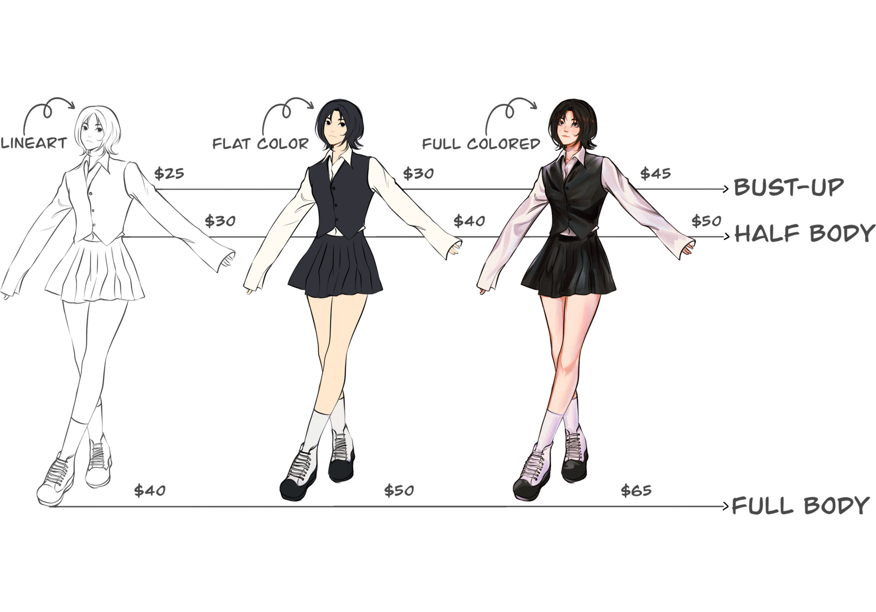 Character design- $100+ (depending on the details to include)This is the base price for 1 character only. Extra characters and backgrounds come with extra fee (info below).COMMISSION ADD-ONS